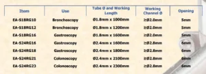 A full range of specifications is available for bronchoscopy, gastroscopy, and colonoscopy. For bronchoscopy, models with a 1.8 mm outer diameter and lengths of 1000 mm and 1200 mm are offered, compatible with working channels ≥ 2.0 mm. In gastroscopy, both slim 1.8 mm × 1600 mm forceps and reinforced 2.4 mm versions with lengths of 1600 mm and 1800 mm are available, suitable for channels ≥ 2.8 mm. For colonoscopy, longer models with a 2.4 mm diameter and lengths of 2100 mm and 2300 mm are provided, also requiring working channels ≥ 2.8 mm. Jaw size is 5 mm for the 1.8 mm instruments and 6 mm for the 2.4 mm instruments.