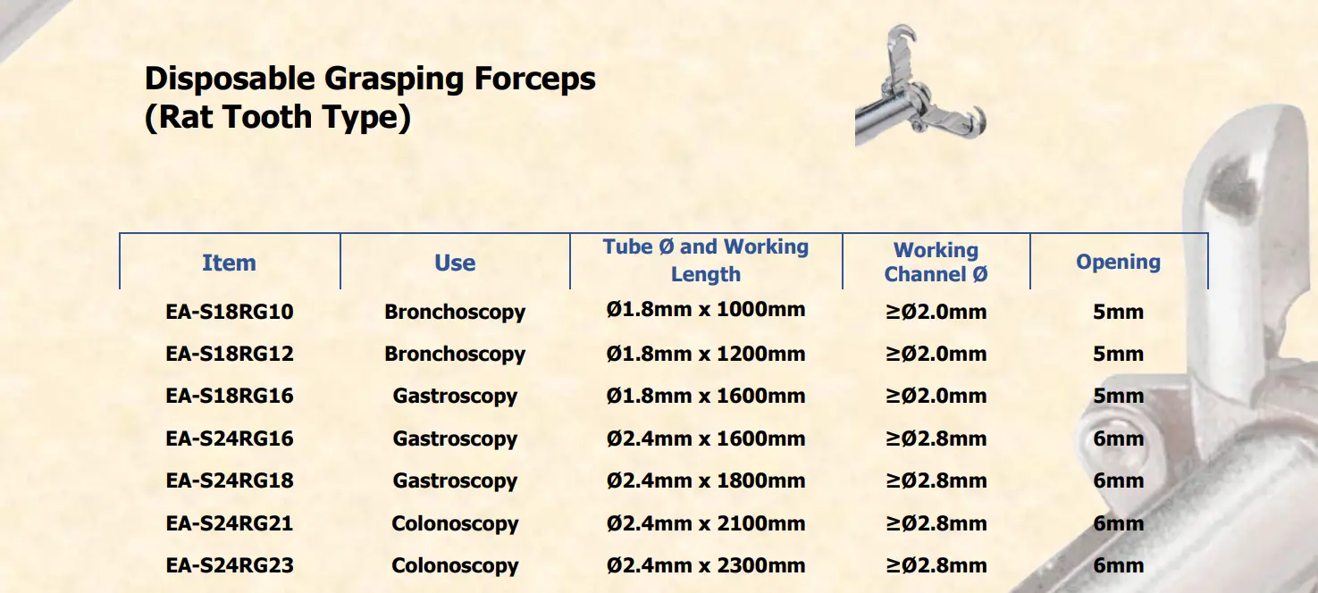 A full range of specifications is available for bronchoscopy, gastroscopy, and colonoscopy. For bronchoscopy, models with a 1.8 mm outer diameter and lengths of 1000 mm and 1200 mm are offered, compatible with working channels ≥ 2.0 mm. In gastroscopy, both slim 1.8 mm × 1600 mm forceps and reinforced 2.4 mm versions with lengths of 1600 mm and 1800 mm are available, suitable for channels ≥ 2.8 mm. For colonoscopy, longer models with a 2.4 mm diameter and lengths of 2100 mm and 2300 mm are provided, also requiring working channels ≥ 2.8 mm. Jaw size is 5 mm for the 1.8 mm instruments and 6 mm for the 2.4 mm instruments.